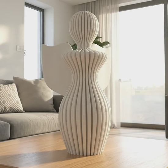 Each Angel features a graceful, flowing form defined by deep vertical ribs that curve gently to create the body. This rich geometry is contrasted by a smooth, spherical head and clean, stylized wings extending from the back. The faceless design gives it a timeless, universal appeal.